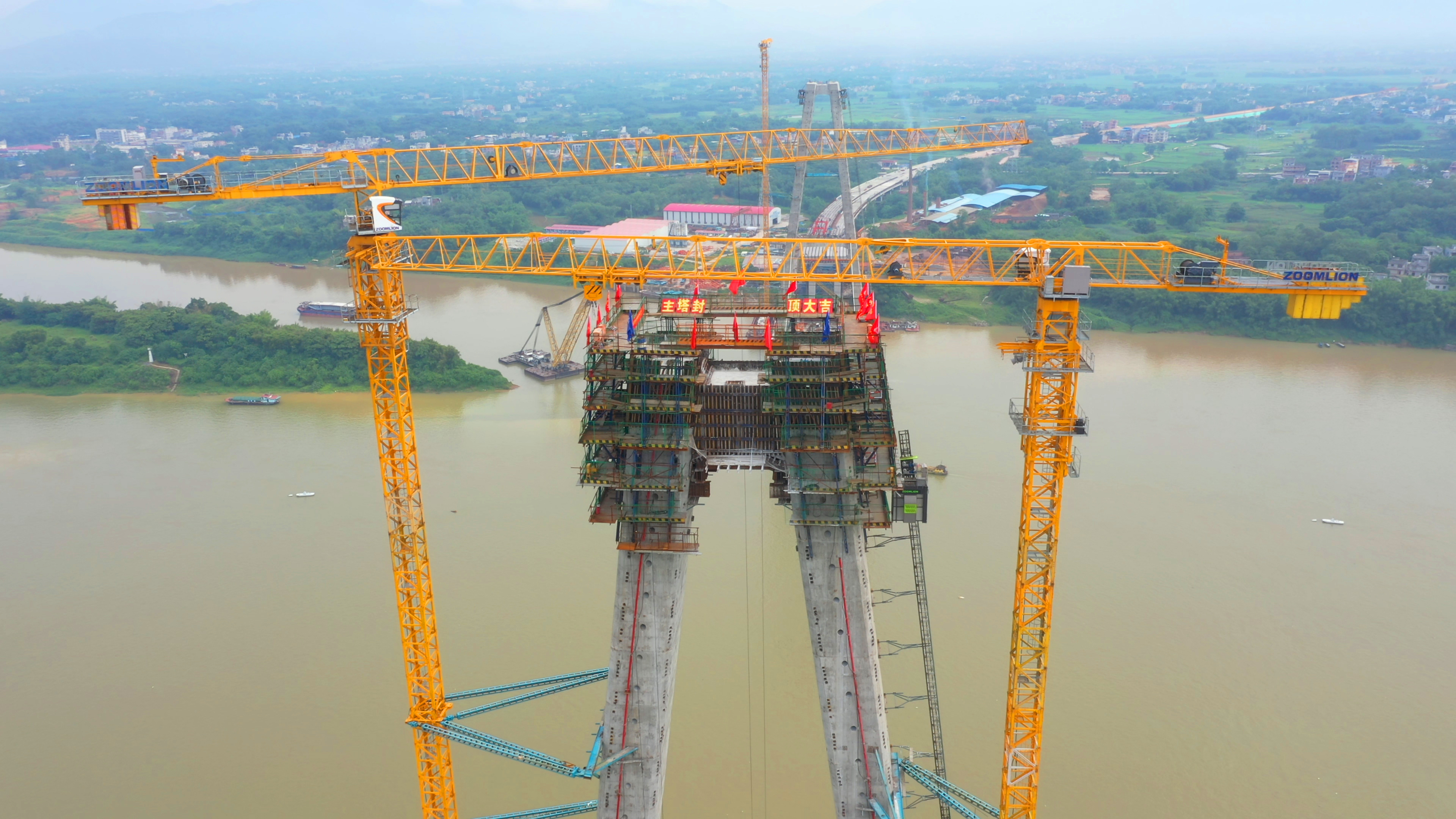 5月28日,廣西最大跨徑斜拉橋——荔浦至玉林高速公路平南相思洲特大橋實現雙主塔封頂。該橋兩座鉆石型塔柱高達147.3米,為廣西最高橋塔。塔柱聳立于潯江兩岸,呈比翼齊飛之勢,大氣磅礴。